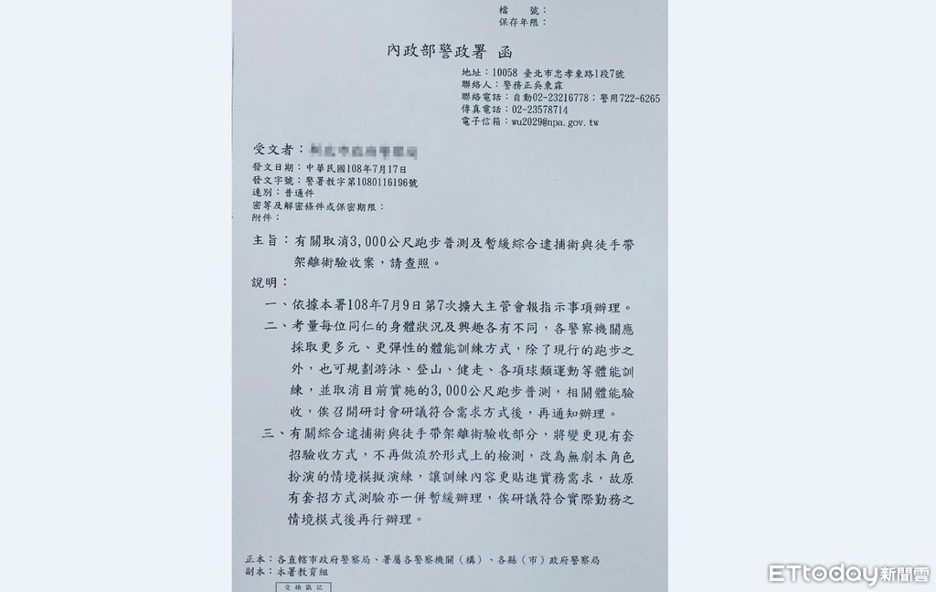 ▲警政署7月17日發函公告取消3000公尺跑步普測。(圖/記者孫于珊翻攝)
