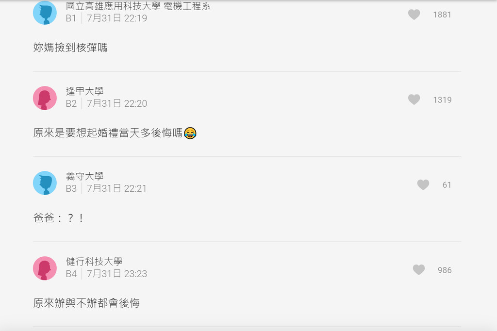 帖文才PO一天,立刻登上熱門,隨即吸引不少網友紛紛留言說「妳媽撿到核彈嗎」、「原來辦與不辦都後悔」、「爸爸表示無言」原PO沒想到,原來,最後悔的人是媽媽,難怪她要一再強調,還用過來人的身份告訴女兒,結婚可能是一件「後悔」的事。