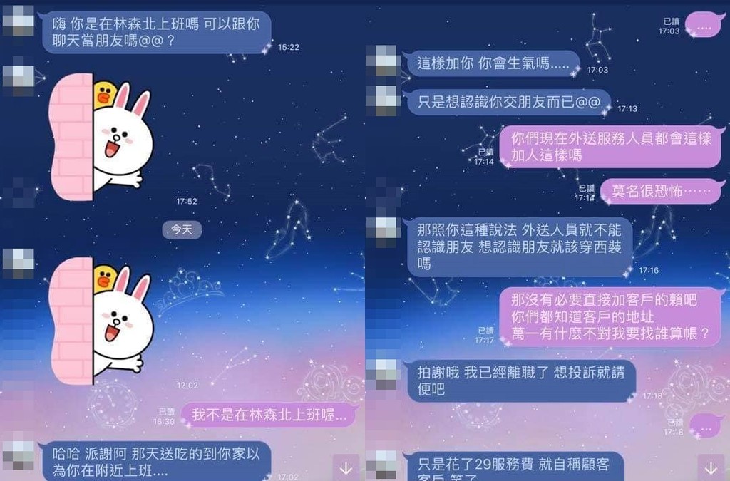 一位女網友7月22日晚間在「爆廢公社」PO出4張對話截圖,表示知名外送平台Foodpanda外送員主動加女客戶的LINE,並直接問「妳是在林森北上班(指當酒店妹)嗎?可以跟妳聊天當朋友嗎?」被拒絕就生氣反過來嗆對方有公主病。女網友將對話公布後還被外送員打電話威脅「你很會Po上網是不是?沒關係那我就把你所有資料po上網看看,然後堵在你家附近。」甚至還會有未知號碼的電話打來。