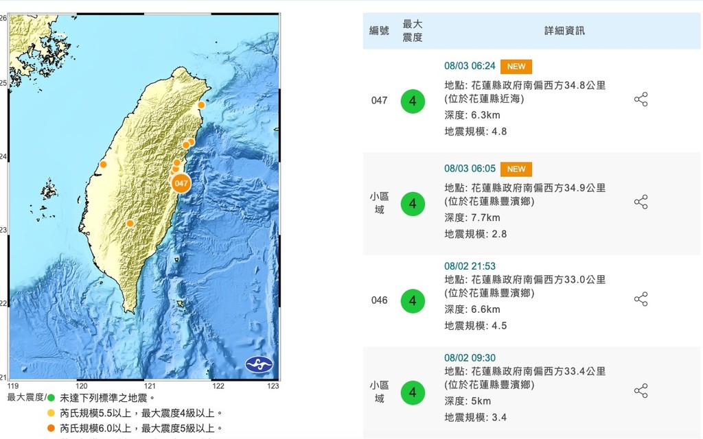今早6點5分,花蓮縣豐濱鄉發生規模2.8地震,深度7.7公里,各地最大震度為花蓮縣4級;另外在6點24分花蓮縣近海也發生規模4.8地震,深度6.3公里,各地最大震度為花蓮縣4級;台東縣、南投縣2級;台中、宜蘭、雲林、嘉義、苗栗、彰化、高雄1級。