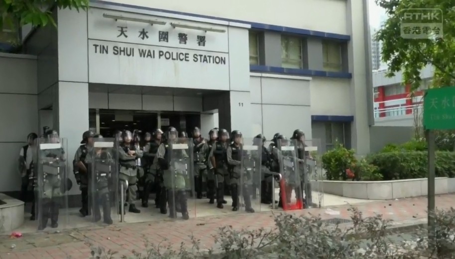 警方發新聞稿表示,大批示威者包圍天水圍警署,並向警務人員投擲石頭,嚴重威脅市民和在場人士的人身安全;並指在多次警告示威者停止違法行為無效,因應現場情況,防暴警察已於天水圍警署外施放催淚煙,使用最低武力驅散示威者。