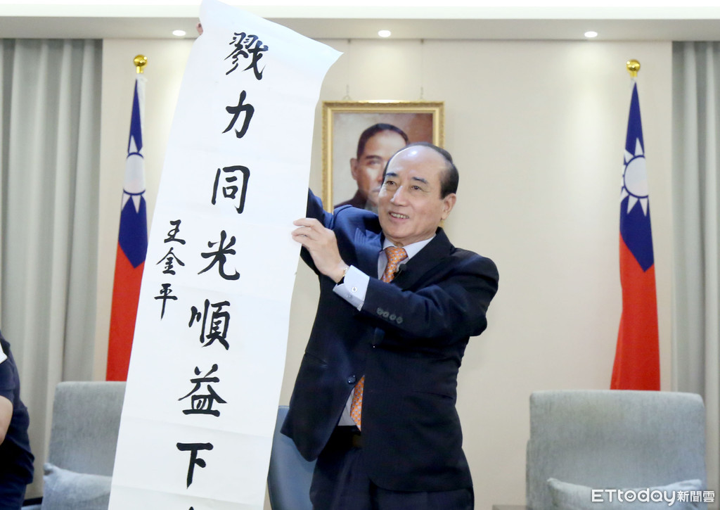▲王金平揮毫「齊心共榮逆增上緣」的下聯致贈網友。(圖/記者屠惠剛攝)
