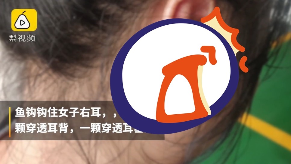 ▲魚鉤竟然同時刺穿少女的耳背和耳垂。(圖/翻攝自大陸《梨視頻》)