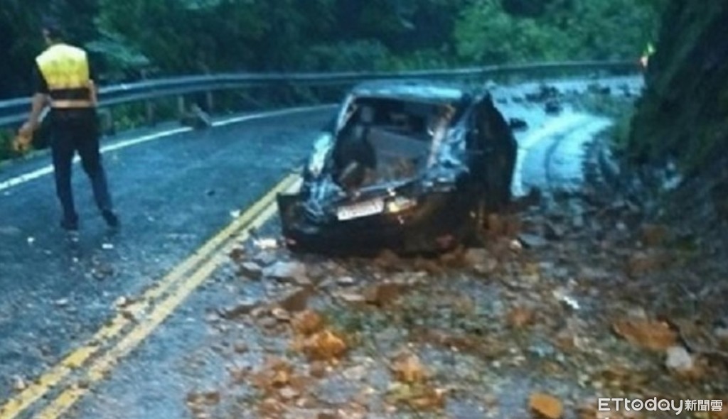 ▲南投山區遇豪雨易發生土石崩落,警方7日因颱風將近,勸離登山客下山,圖為5月16日仁愛鄉台14線因豪雨導致落石擊中自小客車意外。(圖/民眾提供)