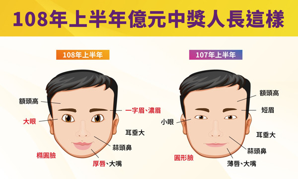 台灣彩券統計今年(民國108年)上半年的中獎資訊,並分析12位億元頭獎得主的長相,看看哪種長相才是今年最招財的「頭獎臉」,相較於去年上半年的高額頭、短眉、小眼、耳垂大、蒜頭鼻、薄唇、大嘴以及圓形臉等特徵,今年除了同樣有額頭高、耳垂大、蒜頭鼻、大嘴4個特徵,還要具備大眼、一字眉、濃眉、厚唇和橢圓臉。