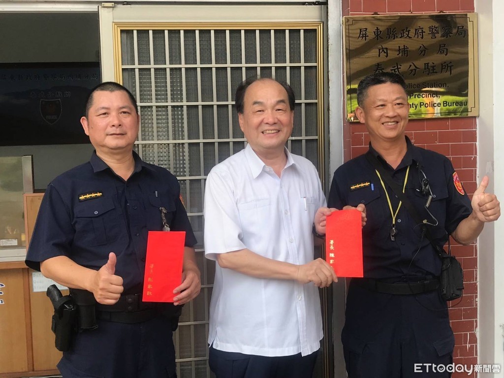 ▲警政署駐區督察林再本(中)頒發工作獎勵金給內埔警分局泰武分駐所副所長鍾春明(右)、巡佐吳豐吉(右)。(圖/記者陳崑福翻攝)