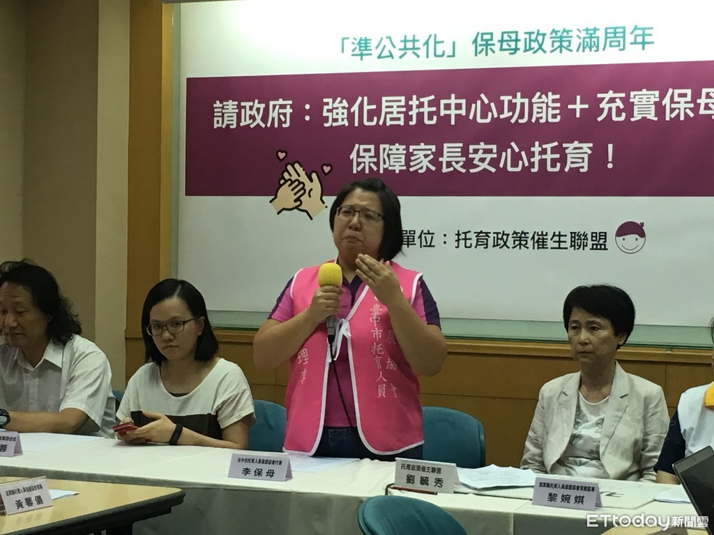 托育政策催生聯盟召集人劉毓秀表示,托育政策為解決少子化問題,然而準公共化保母政策上路週年,仍有2大漏洞,分別是:1、負責執行居家托育管理及輔導的「居家托育服務中心」欠缺法定地位。2、保母人力嚴重老化。