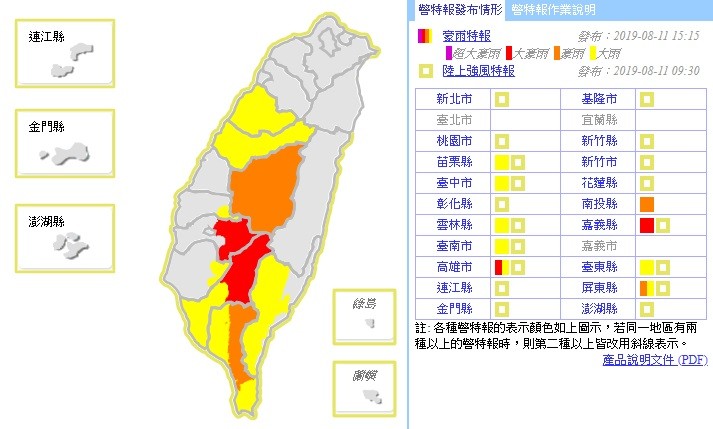 受到西南風偏強影響,氣象局11日持續發布豪、大雨特報,其中嘉義縣、高雄市、屏東縣山區及南投縣有局部大雨或豪雨,尤其是嘉義縣及高雄市山區為局部大豪雨,升級成大豪雨特報,另外,苗栗、台中、高雄、屏東地區及雲林、台南、台東山區則持續發布大雨特報。