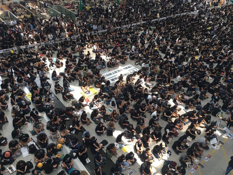 午後一時,機鐵列車已經無空位,車上可見有不少身穿黑衣的市民前往機場。而機場的抵港大堂亦已經坐滿人,不少人戴墨鏡、以黑布矇眼,並大叫口號:「黑警還眼」以及「五大訴求 缺一不可」。現場所見,有示威者帶著鋪蓋前來,相信有打持久戰的準備。