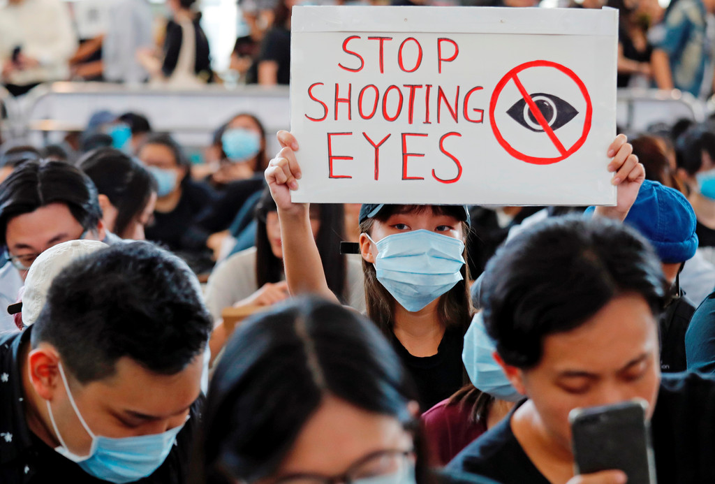 ▲香港機場「警察還眼」集會,聲援受傷少女,抗議警察使用暴力。(圖/路透社)