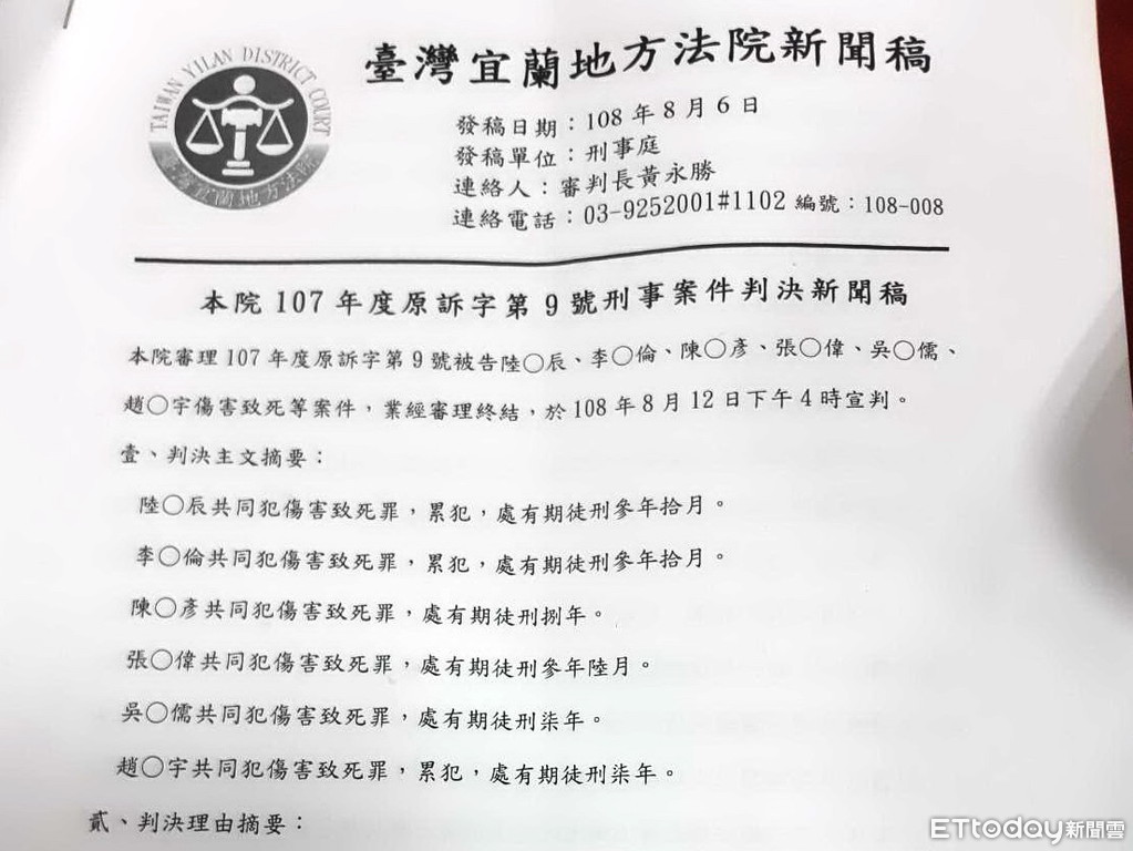 但陳志彥等人與家屬逹成賠償380萬元和解,且家屬要給「年輕人一個機會」等語,因此,法官分別以陳志彥共同傷害致死判8年刑期、趙男因共同傷害致死及累犯判7年、吳男判7年。另外判陸男3年10月、李男3年10月、張男3年6月。