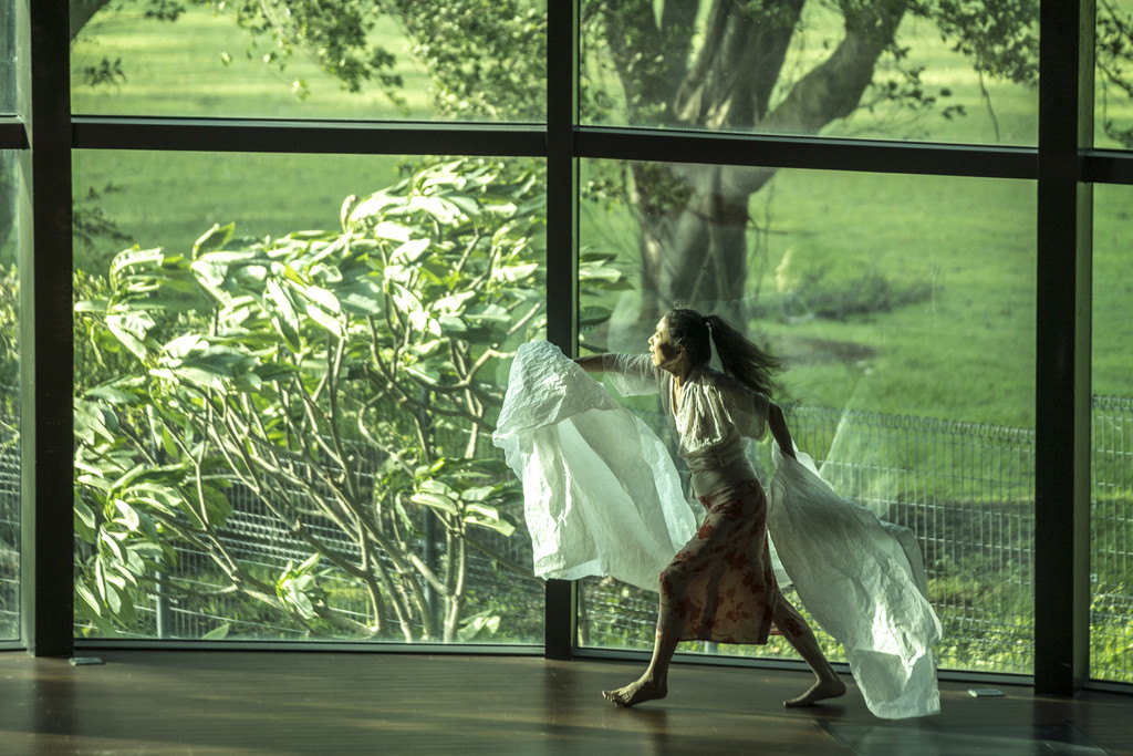 ▲尾竹永子於雲門劇場表演,窗外強風白紙飄蕩,她說:「推開窗戶便與世界連結,這個世界包含福島。」(圖/劉振祥攝/雲門提供)