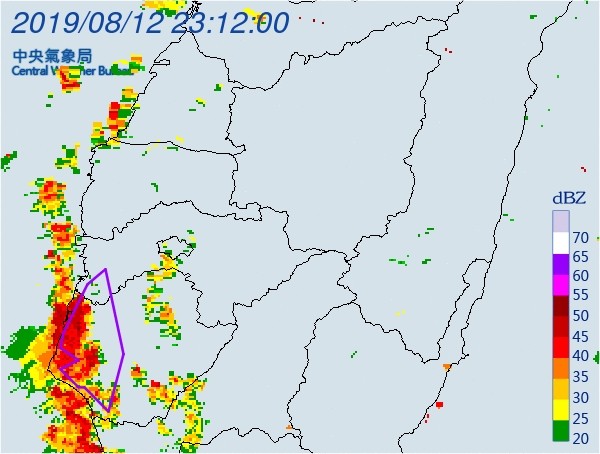 氣象局深夜11時22分發布大雷雨即時訊息,持續時間至13日凌晨0時15分,警戒區域包括嘉義縣布袋鎮、義竹鄉以及台南市鹽水、麻豆、下營、佳里、學甲、西港、七股、將軍、北門、安定、永康、安南、安平、中西、東、南、北區。近1小時時間慎防劇烈降雨、雷擊、溪河水暴漲、坍方、落石、土石流,低窪地區嚴防淹水。