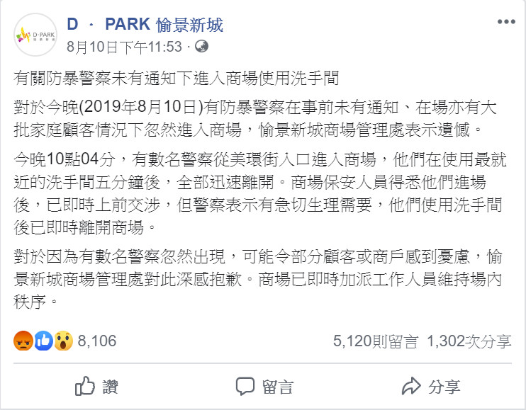 香港新世界集團旗下、位在荃灣的商場愉景新城近日在臉書上發文,對於有防暴警察在事先沒有通知,且在場有大批顧客的情況下突然進入商場深感抱歉,保安人員得知後上前和警方交涉,但他們表示有急切生理需求,在使用洗手間5分鐘後便立即離開。聲明另外界質疑警察上廁所是否還要看商場臉色,對此,新世界表示,商場洗手間一視同仁,供警員使用。