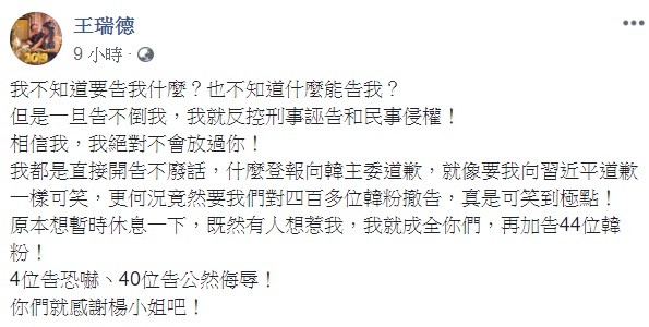 「我不知道要告我什麼」?王瑞德在個人臉書反擊,若楊女最後沒有告成,他就要反控誣告和民事侵權,「相信我,我絕對不會放過你。」他接著指出,要他登報向韓國瑜道歉很可笑,也不會對已提告的400多位韓粉撤告,甚至還要加碼再告,「原本想暫時休息一下,既然有人想惹我,我就成全你們,再加告44位韓粉!4位告恐嚇丶40位告公然侮辱!你們就感謝楊小姐吧!」