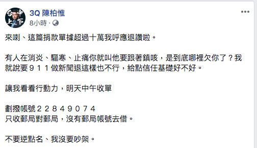 就在這篇貼文發出不到4分鐘,馬上有支持者貼出28萬元的捐款證明,這讓陳柏惟當場回應,活動舉辦4分鐘內結標,「再次呼籲大家退讚」。