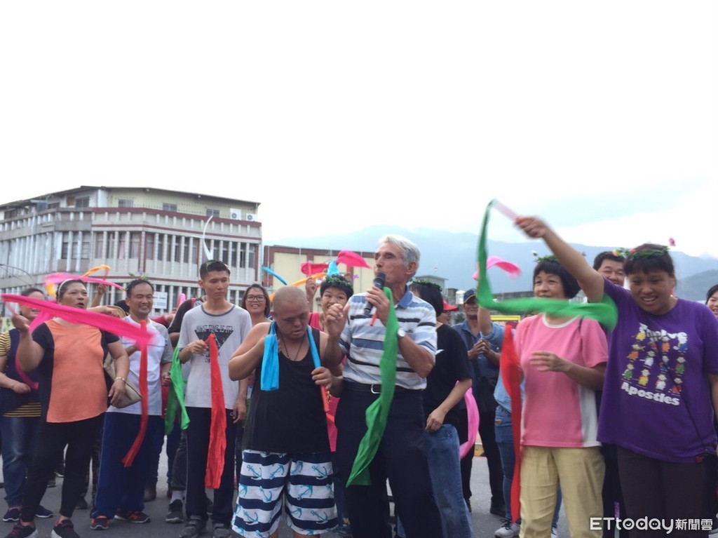 ▲「法國布列塔尼土風舞團」受邀來台巡迴演出,首站玉里,從玉里火車站出發,先進行熱鬧的踩街遊行。(圖/記者王兆麟攝,下同)