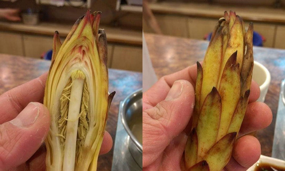 這位男網友在臉書《爆廢公社公開版》貼出照片,文中表示「第一次吃涮涮鍋看到有附這種特別東西,這竟然也可以吃」。仔細看看照片,只見他拿著一個和半個手掌差不多大小的植物,外表是像花瓣或葉子的東西一片一片往上包住,從剖面來看,確實是層層包住中間的芯,彷彿包心白菜一般。