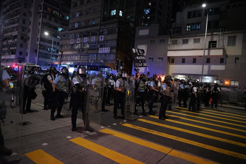【22:00】荔枝角道深水埗警署位置有約60名防暴警員部署,警方向記者警告,會發射催淚彈。