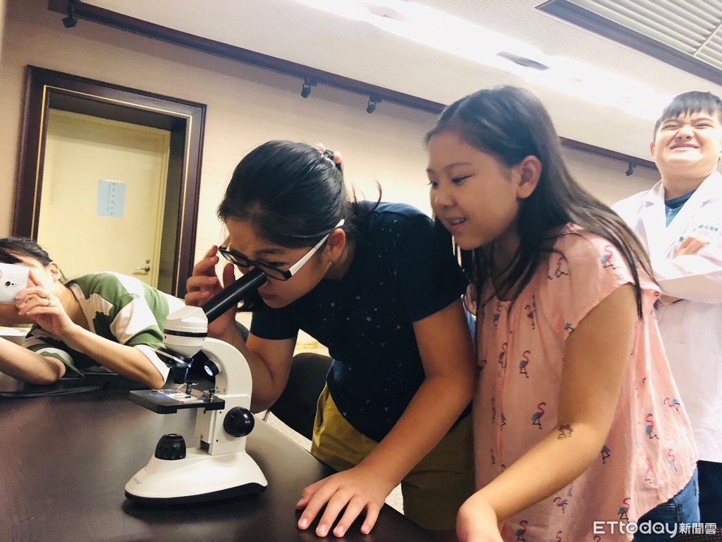 ▲國泰醫院2019醫學夏令營,學童認真觀看顯微鏡下的過敏原-塵蟎(圖/國泰醫院提供,下同)