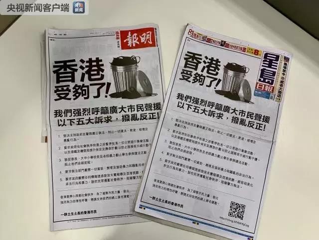 ▲香港多份報紙刊出文章提出香港市民的5大訴求。(圖/翻攝自「央視新聞」微信公眾號)