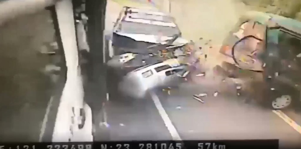 這起事故發生在15日下午,當時銀色休旅車想要從內線超車,卻突然撞上停在一旁的廂型車,砰的一聲巨響,巨大的撞擊力道不僅讓車頭支離破碎,還直接將另一台廂型車給撞飛,畫面相當驚悚。對此,一旁遭超車的駕駛看到後,也心有餘悸地表示,當時聽到巨響,還以為是爆胎,後來才發現竟然如此嚴重。