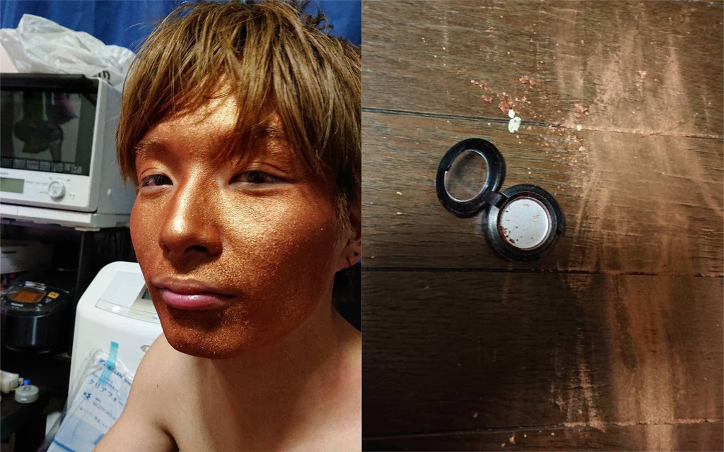 日本網友「@ j4db836fd7cyu51」5日上傳3張照片,附文寫道,「不小心把女友的化妝品摔碎了,女友氣到全部塗到我臉上。」只見地上粉末斑駁,一顆碎裂的MAC眼影破破爛爛地在一旁,細看已被摔到面目全非,而男網友的臉上則被塗滿「珠光橘」眼影,整張臉充滿閃亮光澤感,一臉無奈地變身「18銅人」。