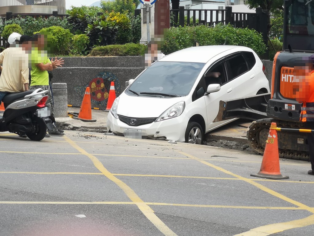 新北市淡水區淡水國小前16日下午1時許進行管線汰換工程,豈料工人忙著施工,忘了在停車場出入口鋪設鋼板,一名黃姓媽媽當時接孩子放學,才剛駛出停車場,車頭「瞬間急墜」,當場卡進溝渠中動彈不得,所幸警方獲報後立即趕赴現場協助,2人也僅受到驚嚇,並未受傷。
