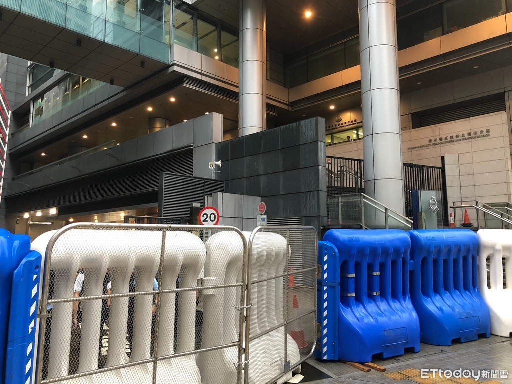 ▲灣仔警署外架設起俗稱「水馬」的充水式護欄。(圖/記者黃彥傑、陳以昇攝)