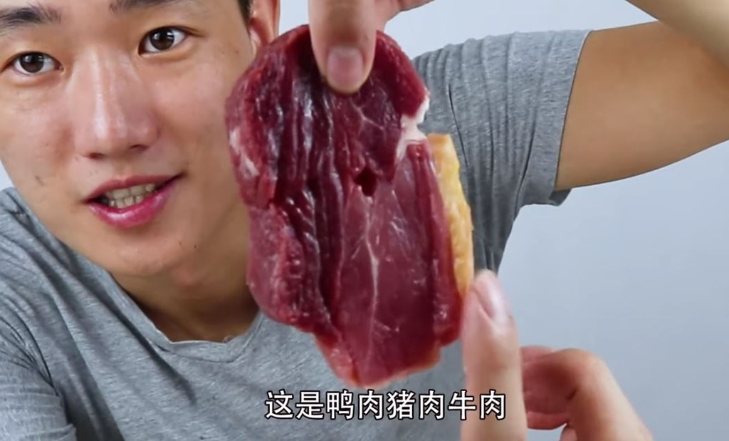 ▲不論是用切片或切碎的方式,豬牛鴨3種肉都緊密的黏合在一起。(圖/翻攝自YouTube/衣谷水原egg)