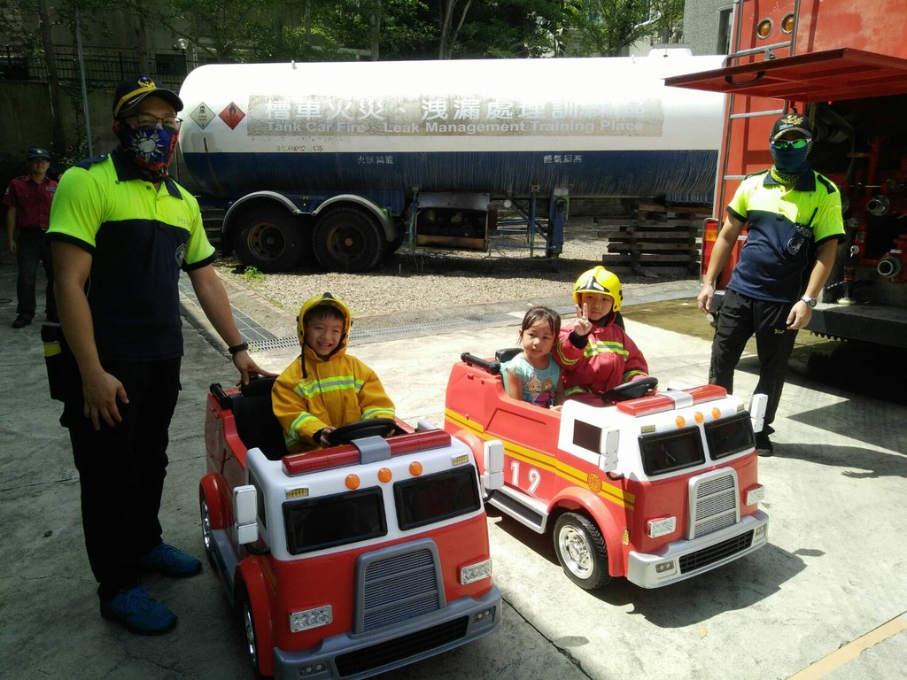 ▲▼小朋友在火災搶救體驗中,更可以穿上特別訂作的「迷你消防衣」,體驗搭乘雲梯車營救受困民眾、射水滅火。