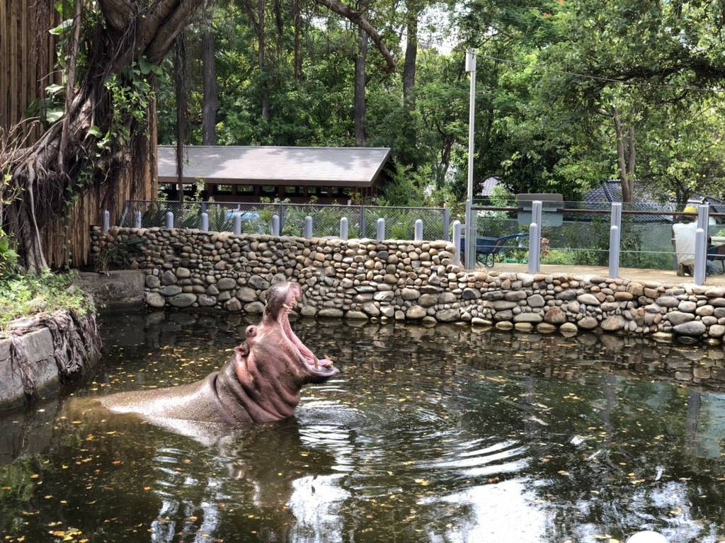 接著進入河馬樂樂的新家參觀,小朋友們不僅跟樂樂同框合影,更忍不住在樂樂張大嘴巴時發出讚嘆驚呼,孩子們與樂樂超萌的模樣讓爸媽們手機相機拍個不停,不過,志工們也隨時提醒小朋友記得尊重動物,不要驚擾到牠們。