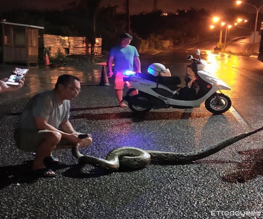 高雄街頭深夜驚見大蟒蛇!有民眾在大寮區大坪頂路段,目擊一條至少超過2公尺長的大蟒蛇在馬路上「趴趴走」,嚇得趕緊通報消防局,消防人員帶著蛇籠趕到現場,發現蛇的體積實在太大,只好折返、改拿更大的空桶來捕蛇,結果現場已經有英勇民眾直接徒手抓蛇、讓這場驚魂記平安落幕。