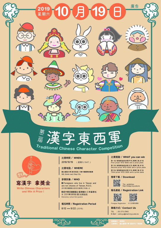 嘉義大學語言中心華語組為慶祝嘉大百年校慶,推廣繁體字之美,邀請外籍人士及國小三年級學生10月19日上午9時30分,至嘉大新民校區國際會議廳參加「國立嘉義大學X第二屆漢字東西軍比賽」,提升對漢字文化的認識,瞭解漢字來源與文化,增進學習華語文興趣。比賽詳情及報名資訊,可至FB臉書搜尋「NCYU CSL嘉義大學華語組」或網站https://csl.lgc.ncyu.edu.tw查詢