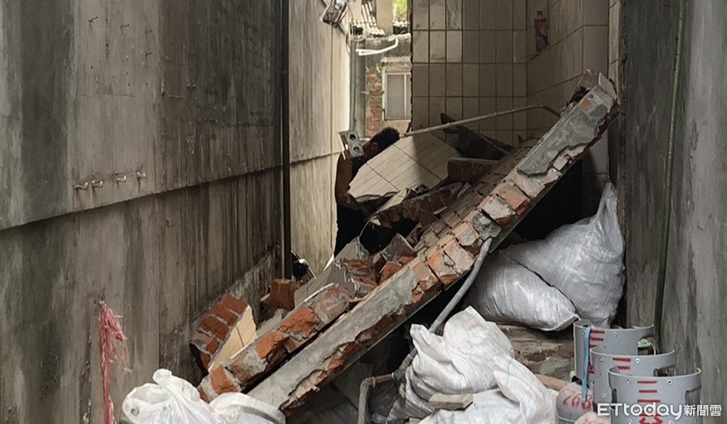 ▲外牆倒塌壓傷工頭,所幸無生命危險,以下同。(圖/記者陳雕文翻攝)