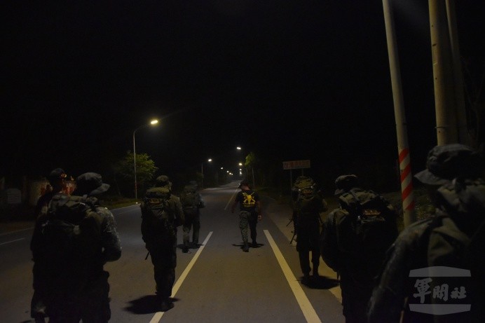 21日夜間進行負重急行軍,學員們背負近30公斤裝備,以每小時6至7公里速度執行行軍任務,過程中由教官下達狀況,目的在考驗學員們在精神與體力負荷下,保持冷靜思緒順利達成任務。