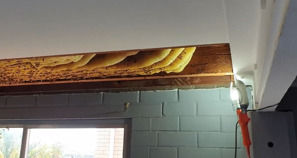 澳洲布里斯本婦人Laurel Loosham原本在家中對蜜蜂的嗡嗡聲不以為意,時間久了她意識到應該要把蜂巢移除,掀開天花板後,驚見50公斤重、金黃色長條狀的蜂巢幾乎要覆蓋整個天花板,估計約有5至6萬的蜜蜂,畫面非常的壯觀。