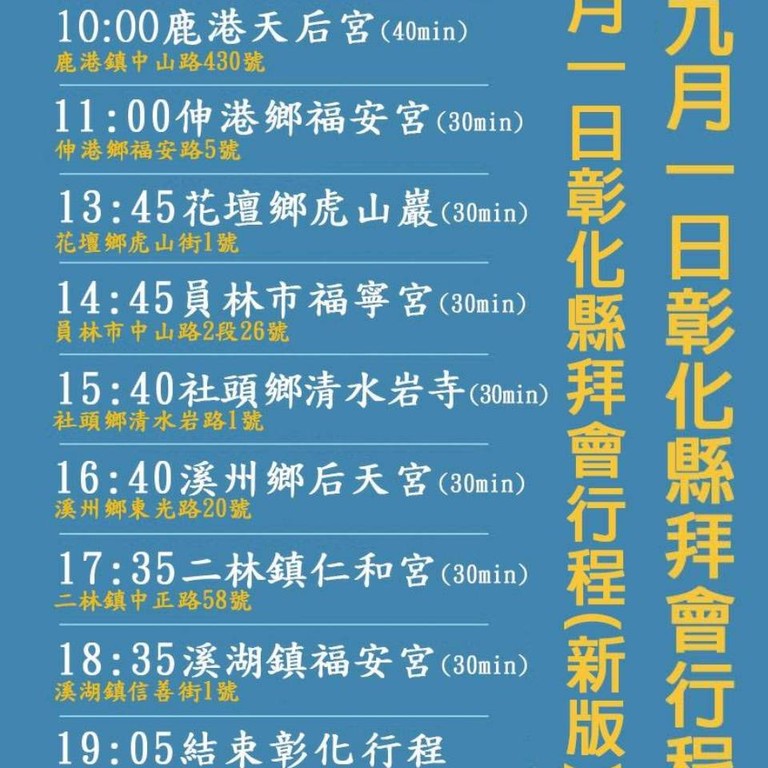 韓國瑜到彰化首站,由立委排定參訪8個行程,上午10點先到鹿港天后宮,預計停留40分鐘,11點到伸港福安宮,13點45分到花壇鄉虎山巖,14點45分員林市福寧宮,15點40分到社頭鄉清水岩寺,16點40分到溪州鄉后天宮,17點35分到二林鎮仁和宮,18點35分到溪湖鎮福安宮,19點05分結束彰化行程。每站停留的時間30分鐘,卻獨漏黨政大老必到訪的鹿港玻璃媽祖廟,也讓外界堆滿質疑的問號。