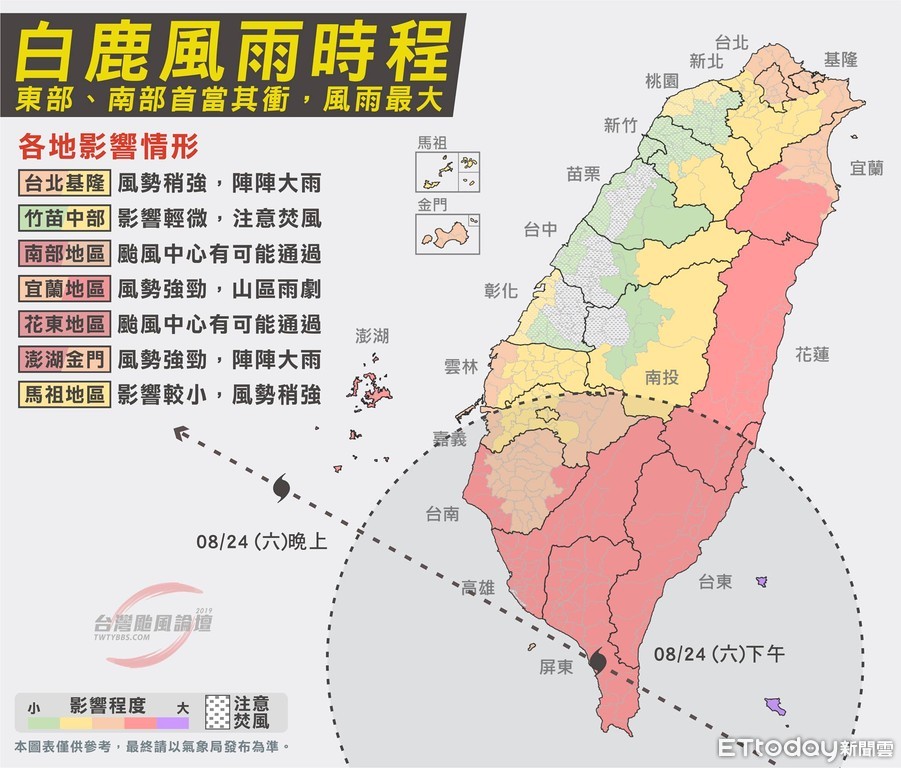 粉專也分析,白鹿颱風強度、範圍不夠大,預計風雨分布將呈現「南、東>北、中」的趨勢,對全台影響集中在週六。屆時花東、恆春一整天風雨都很大,特別是台東至恆春等地需嚴防颱風登陸時的狂風暴雨。至於南部、澎湖待颱風過山後須小心回南現象帶來的強風豪雨;北部、中部風雨感受有限,但北北基受地形影響,仍不時會有強陣風;位於背風面的桃竹苗、中部則要留意焚風。