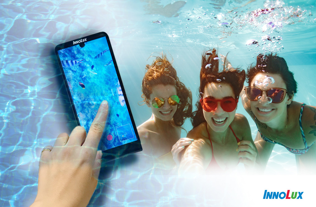 群創發表的「6.17吋全球第一支水下觸控手機」,讓潛水也可以玩自拍,主要是以水下內嵌式觸控專利技術,做到全球唯一可進行高解析度、支援水下使用的電容式觸控全屏顯示器,打破過去大部分標榜防水顯示屏是新增實體按鍵達到簡單的控制技術,或是增加主動式觸控筆的電磁模組的方式。