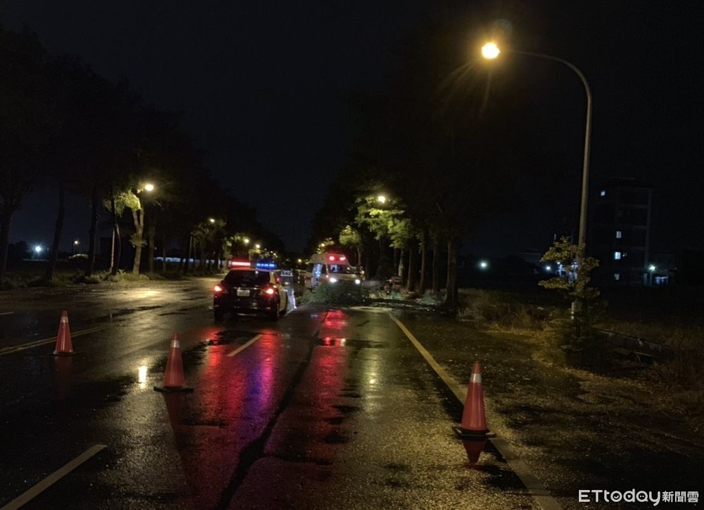 ▲白鹿颱風襲台,安南區安吉路二段與台江大道三段交叉口路樹倒塌案件後,即刻派員前往現場處理,並於25日凌晨1時左右清理完成。(圖/記者林悅翻攝,下同)
