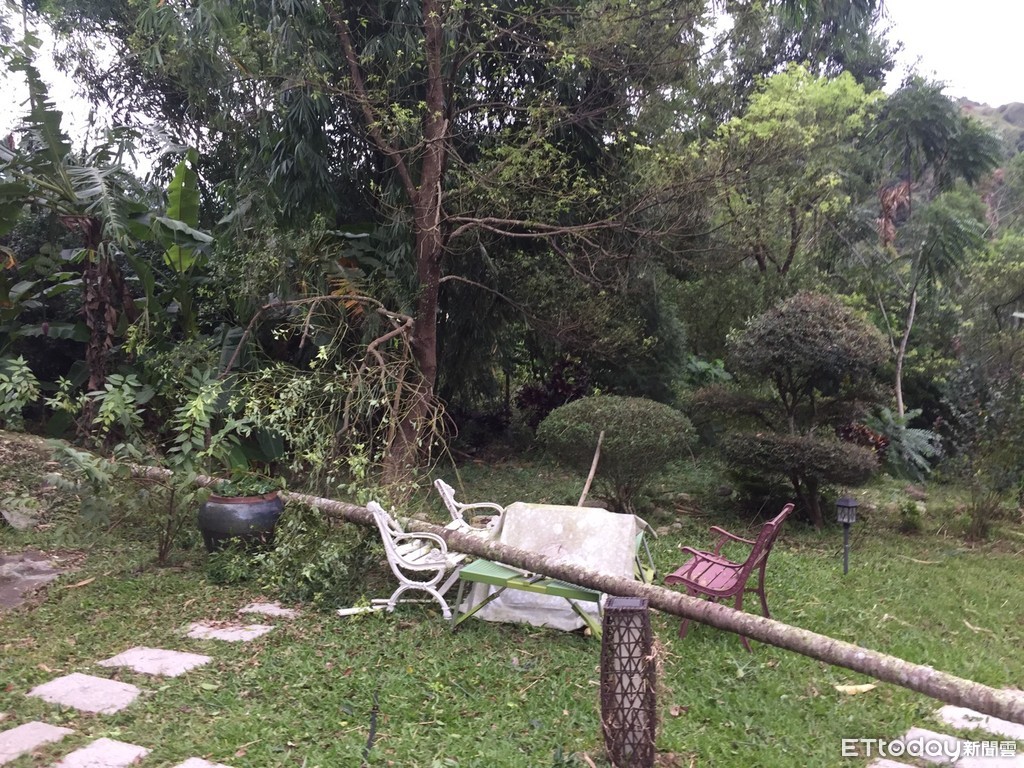 ▲輕颱白鹿24日侵台,在南投縣國姓鄉帶來強烈風勢吹倒庭院樹木,壓垮野餐桌組。(圖/記者白珈陽攝)