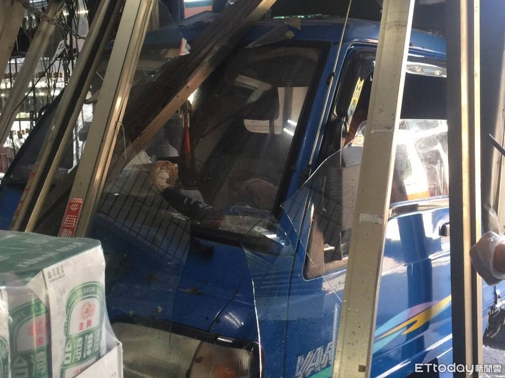 透過監視器畫面,清楚看到藍色的自小貨車幾乎完全沒有煞車,直接朝超市撞進去,正在店內櫃檯結帳的老闆娘,被這突來的一撞嚇得後退了好幾步,事後回想起還心有餘悸的表示,「砰!很大一聲,就看到門整個凹了進來,接著車頭就撞上櫃台,兩位客人還一度被卡在櫃檯旁,幸好人都沒怎樣!」