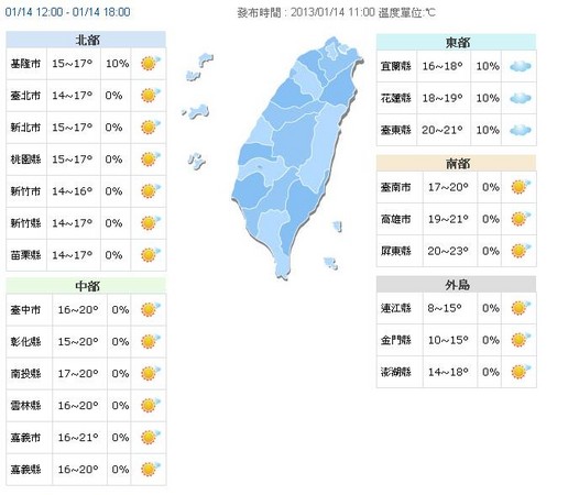 另外,中央氣象局提醒,14至15日晨大陸冷氣團影響,台灣中部以北及東北部地區氣溫較低,其他地區早晚氣溫也低;14日各地大多為晴到多雲的天氣。15日白天冷氣團減弱,氣溫回升,各地大多仍為晴到多雲的天氣,僅東北部及東部地區有局部短暫雨。