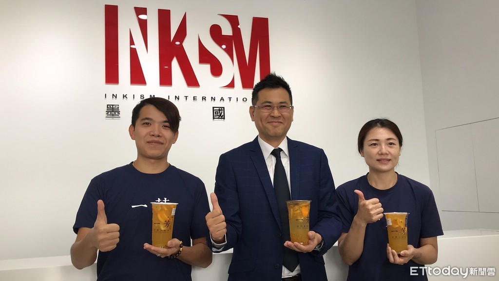 ▲一芳總經理劉曜州(中)與加盟主拿著水果茶合影。(圖/記者陳玉攝,下同)