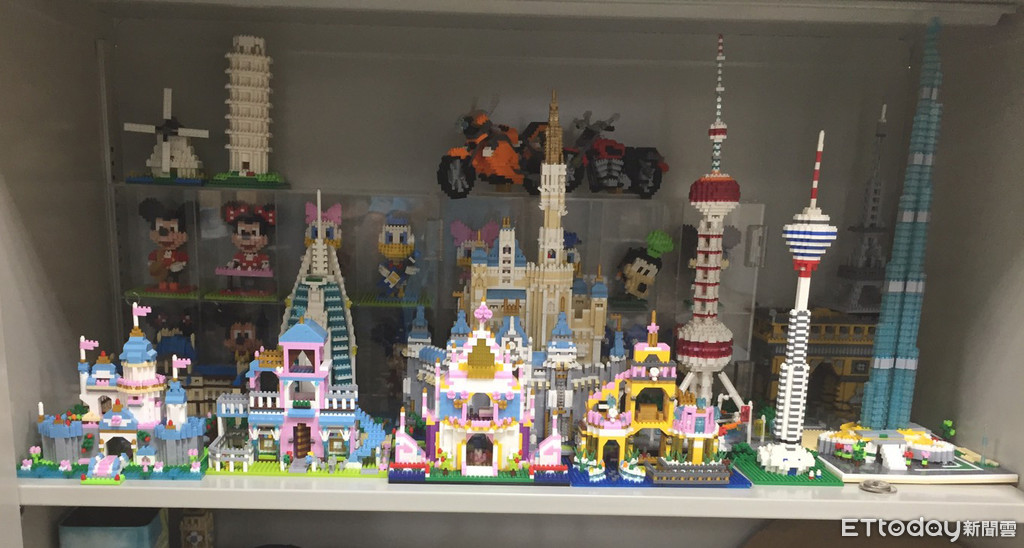 ▲勇警薛定岳內務櫃裡放滿積木公仔成品,最右邊為杜拜塔成品。(圖/記者張君豪攝)