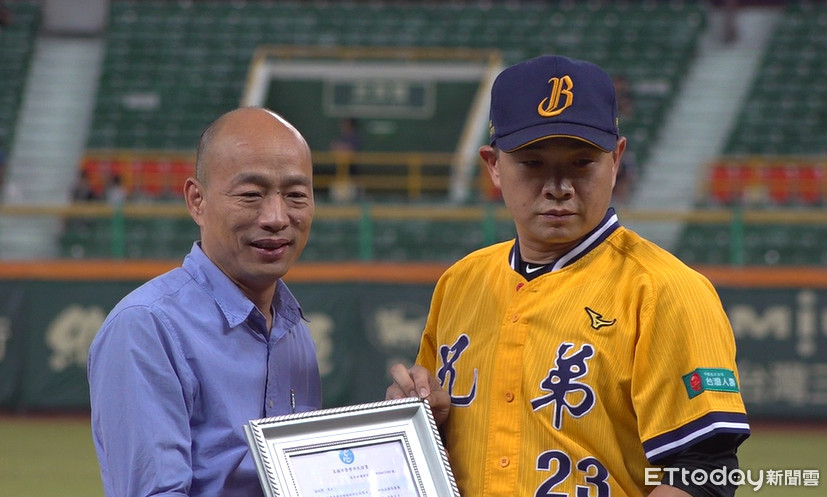 ▲高雄市長韓國瑜和中信兄弟彭政閔。(圖/記者賴君欣攝)