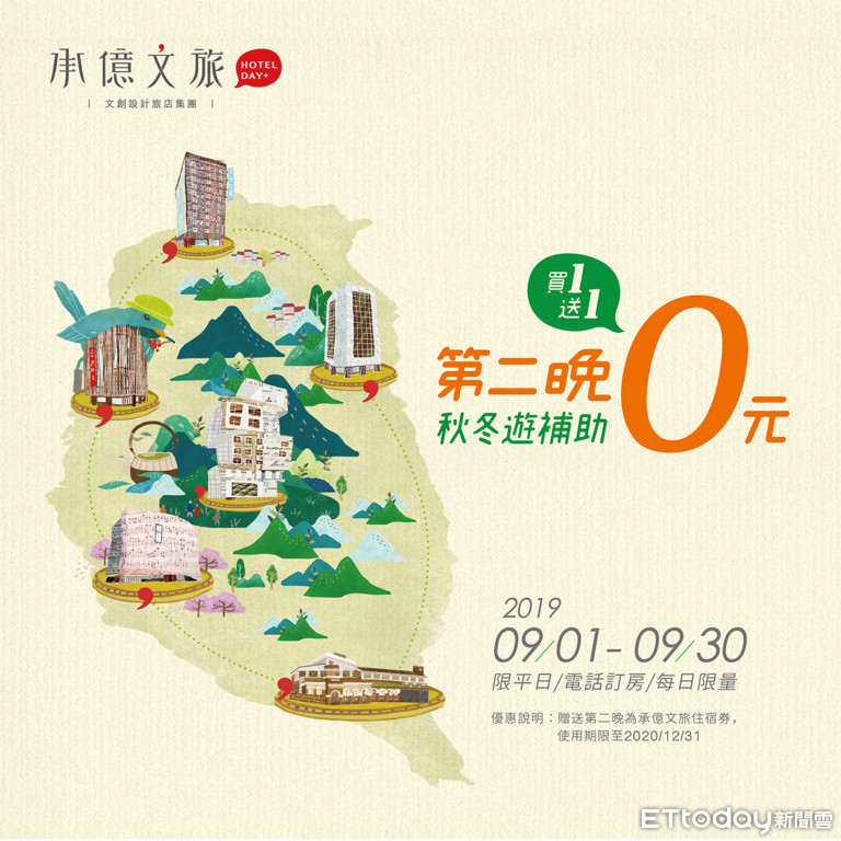 以一館一主題為特色而深受文青旅人喜愛的承億文旅集團,旗下共有淡水吹風、台中鳥日子、嘉義商旅、桃城茶樣子、墾丁雅客小半島及花蓮山知道等六家旅店共同響應政府政策。花蓮山知道原定價$5,500台灣白標準雙人房(間)自2019年9月1日起至2019年9月30日,週日到周五優惠價$2,800(間)並加贈一張承億文旅集團雙人房住宿券,住宿券使用期限至2020年12月底,若再使用政府秋冬補助$1,000元,等同$1,800即可輕鬆入住承億文旅集團旗下分館共兩晚。