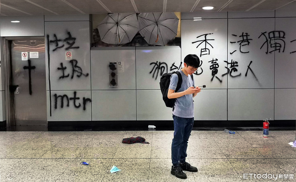 ▲示威者於8月31日在地鐵站內噴滿抗議標語。(圖/記者黃彥傑攝)