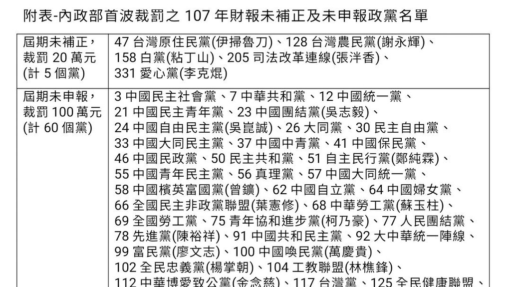 ▲內政部首波開罰65個政黨。(圖/內政部提供)